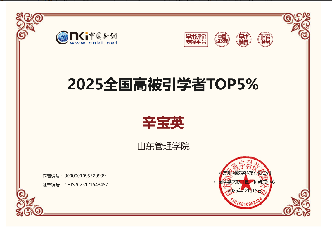 近日,中国知网发布“2025全国知网高被引学者”名单,我院院长辛宝英教授继2024年后,本年度再次入选“全国高被引学者TOP5%”。