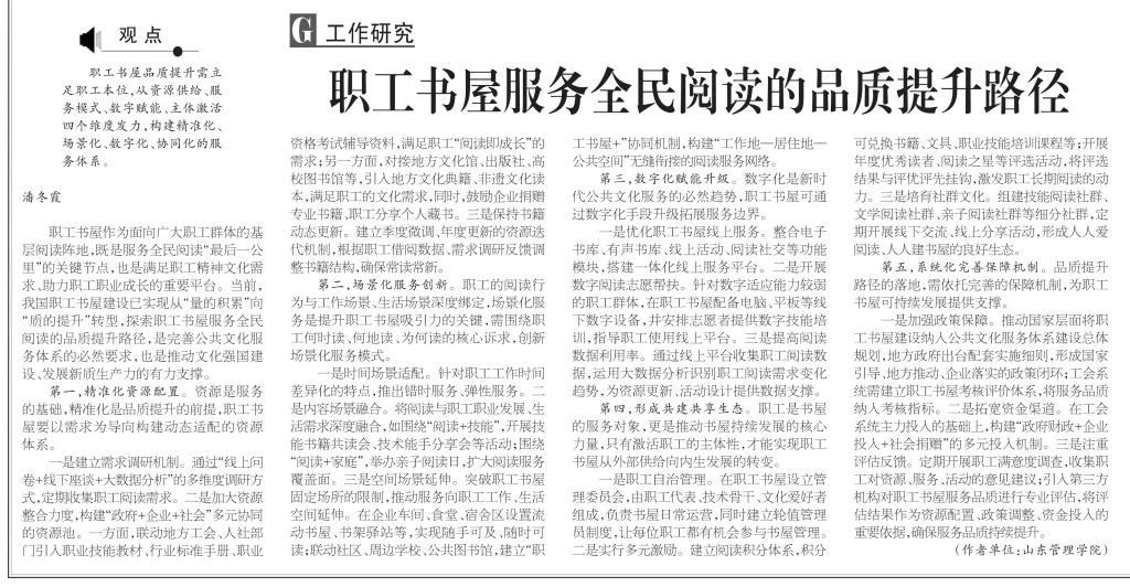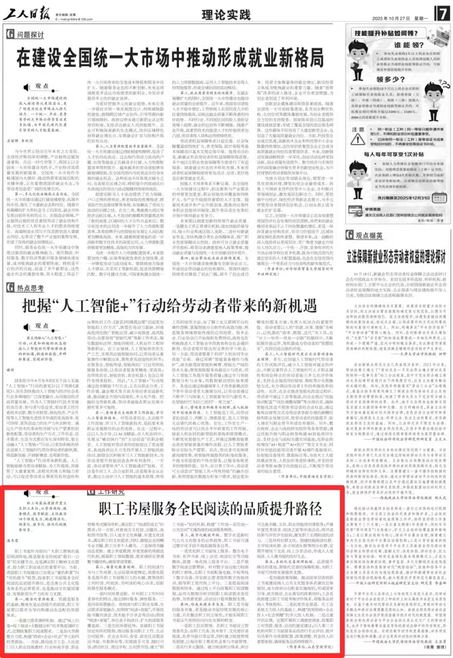 10月27日,我院教师潘冬霞撰写的理论文章《职工书屋服务全民阅读的品质提升路径》在《工人日报》理论实践版发表。